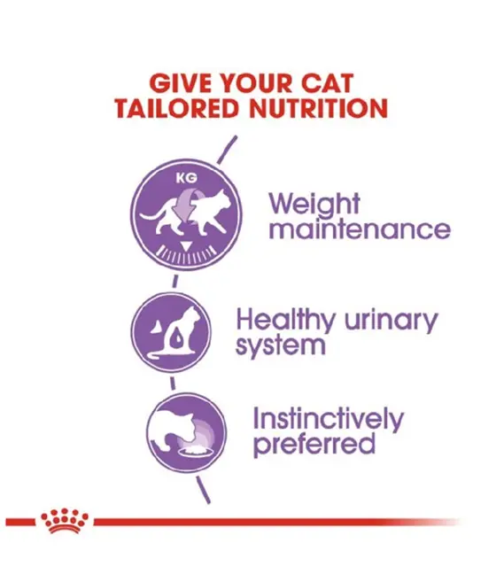 بعد از عقیمسازی، سطح متابولیسم و نیاز انرژی گربه کاهش مییابد، در حالی که اشتهای آن افزایش مییابد. این فرمول با کاهش ۱۰٪ کالری نسبت به غذاهای استاندارد و افزایش فیبر، به احساس سیری طولانیتر کمک کرده و از چاقی جلوگیری میکند. همچنین، تعادل دقیق مواد معدنی (کممنیزیم، فسفر و کلسیم) خطر ابتلا به سنگهای ادراری استروویت که در گربههای عقیمشده شایعتر است را کاهش میدهد.
