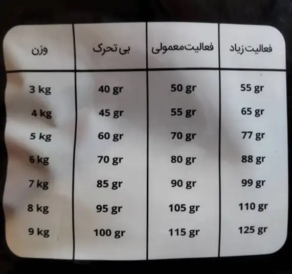 میزان مصرف روزانه؟گربه ۴ کیلویی: ۵۵-۶۰ گرم، گربه ۶ کیلویی: ۷۵-۸۰ گرم.